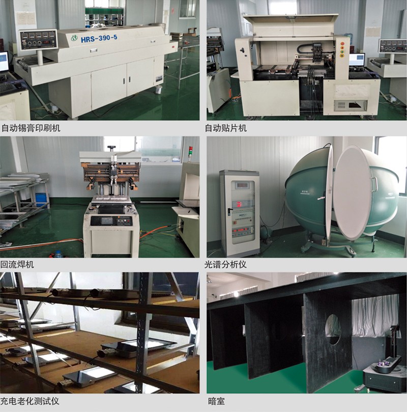 LED燈具車間擁有先進的封裝設備,其中包括--些針對任何封裝的高功率LED光色電分檔的專用生產(chǎn)線設備,測試成品光強,光照度的暗室以及模擬高低溫,沙塵等環(huán)境的檢測設備。所有成品都必須經(jīng)過各種檢測設備的嚴格檢驗,才可以出廠。